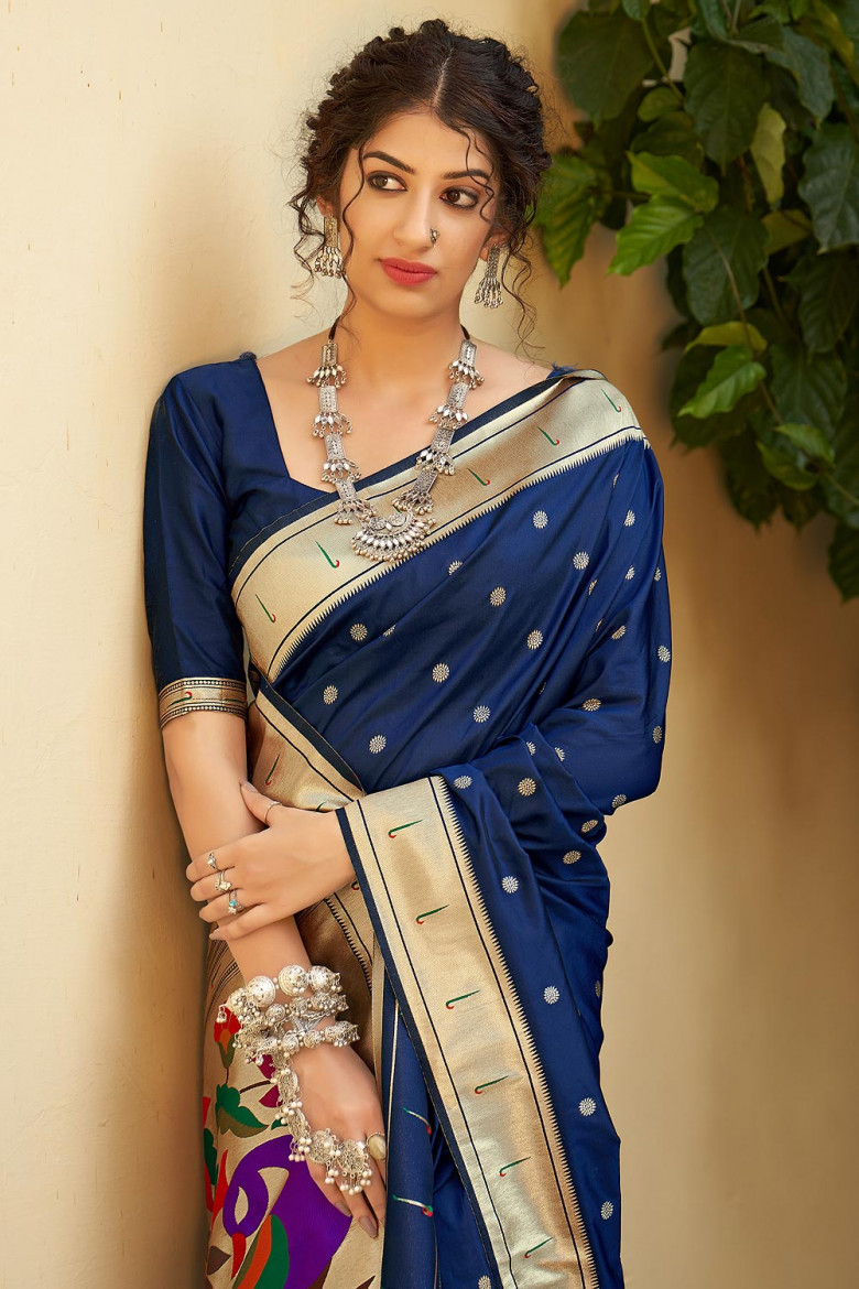 This navy blue banarasi silk saree is the best pick for the wedding season. This Indian traditional sari is crafted with super soft banarasi silk fabric with Zari weaved motifs and border.