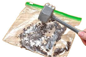 A ziplock bag, a flat, hard surface, such as a counter or chopping board, and a meat tenderizing hammer are required.