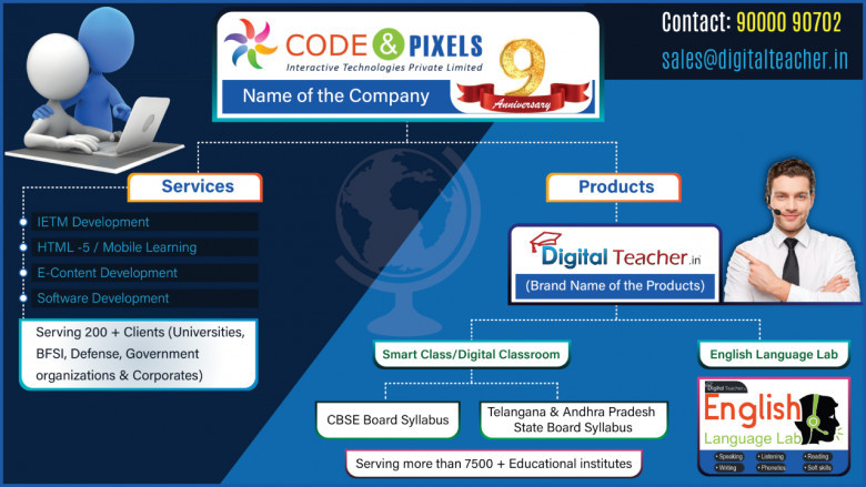 Code and Pixels is best among top 10 eLearning companies in Hyderabad, India. Code and Pixels Interactive Technologies Private Limited (C&P) is an E-Learning service provider based in Hyderabad (India). We provide end-to-end E-Learning solutions, specialized in innovative use of technology.